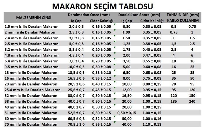 Isı ile Daralan Makaron - Farklı Boyut ve Renk Seçenekleriyle! Isı ile daralan makaronlar, elektriksel, mekanik ya da estetik amaçlarla kullanılan mükemmel bir üründür. Yüksek kaliteli plastikten üretilen bu makaronlar, ısı uygulandığında orijinal boyutlarının %50'sine kadar küçülerek, mükemmel bir şekilde etrafına sıkıca oturur. Elektronik devreler, teller, kablolar, bağlantı noktaları ve daha fazlası için ideal çözümdür. Ürün Özellikleri: Boyut Seçenekleri: Küçükten büyüğe her türlü ihtiyacınıza uygun boyut seçenekleri mevcut. Renk Çeşitleri: İhtiyacınıza ve projelerinize uygun çok çeşitli renkler mevcuttur. Yüksek Isı Direnci: 90°C ile 250°C arasında yüksek ısıya dayanıklıdır. Kusursuz Uyum: Isı uygulandığında daralarak mükemmel uyum sağlar. Kolay Uygulama: Sadece bir ısı tabancası ya da ısı kaynağı ile hızlı ve pratik bir şekilde uygulanabilir. Kullanım Alanları: Elektronik devrelerde koruma Kablo ve tellerin izolasyonu Elektriksel bağlantıların güçlendirilmesi Otomotiv ve sanayi uygulamaları Isı ile daralan makaronlar, dayanıklı ve güvenilir olmalarıyla bilinir. Çeşitli renk seçenekleri ve boyutları ile her türlü ihtiyaca çözüm sunar.